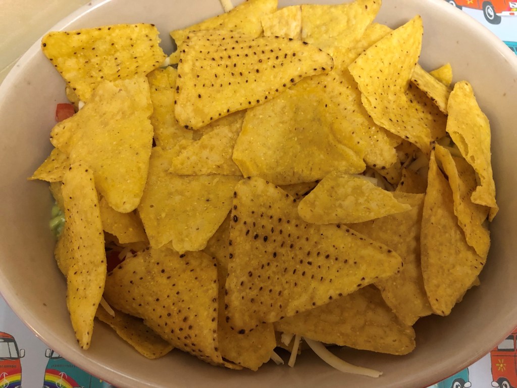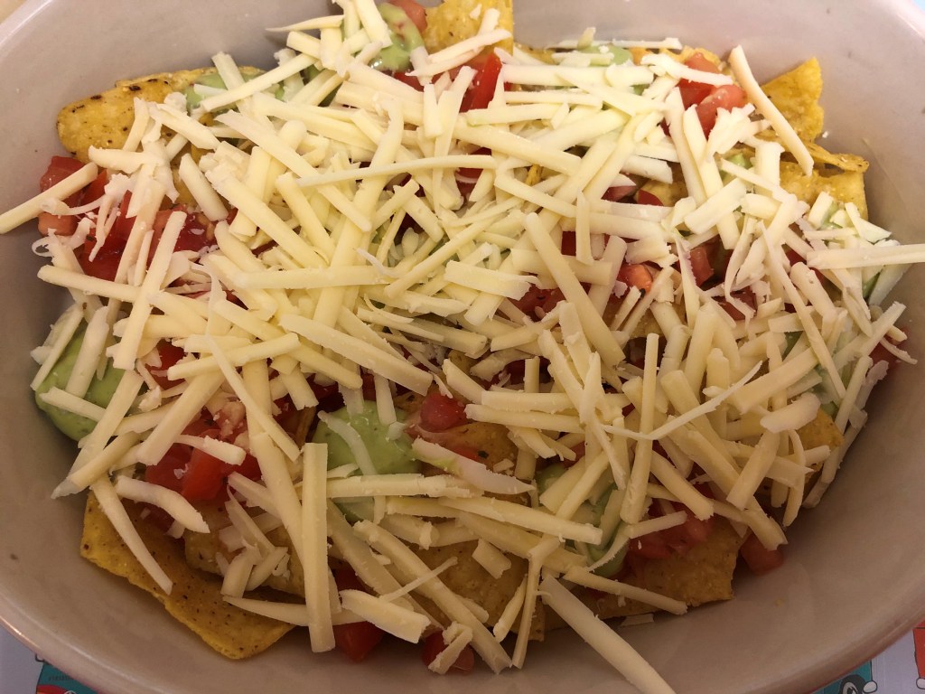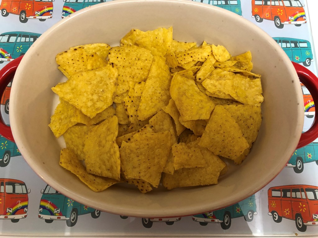 - Spread half the packet of tortilla chips into the bottom of an oven proof dish and spread half the tomato salsa, a good amount of guacamole and half the cheese on top.