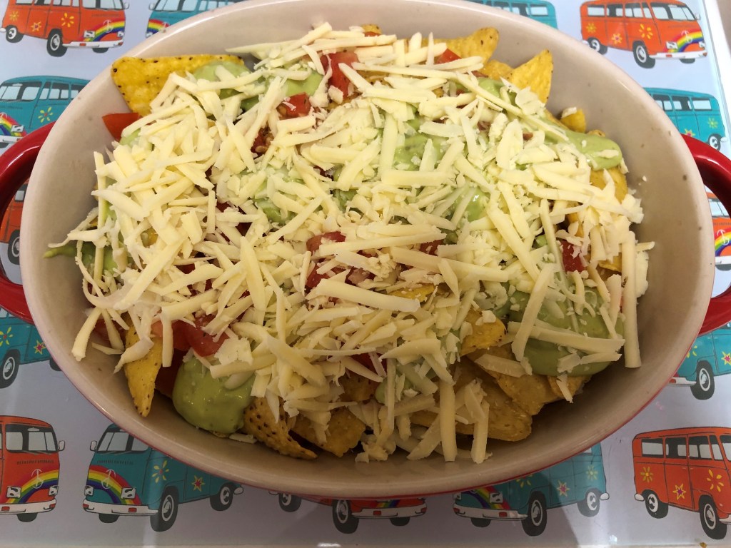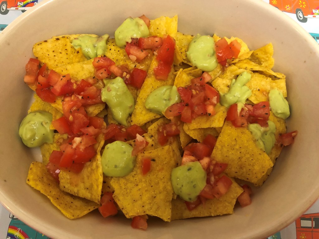 I have included a really simple salsa recipe below, which I use on my nachos, but feel free to use shop-bought salsa instead. Equally, I don’t have a guacamole recipe, so I use shop-bought, but if you have one, by all means, use you’re own. I’m a bit of a woose when it comes to spice, so I haven’t used jalapenos, chillies or refried beans, but if you like your nachos with a kick, go to town, top them with whatever you like. Most plain corn tortilla chips are gluten free, but just double check the packet if this is a concern.