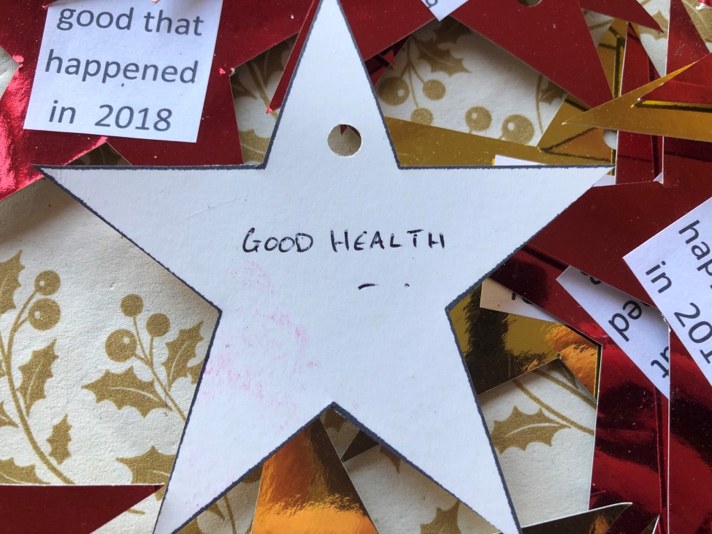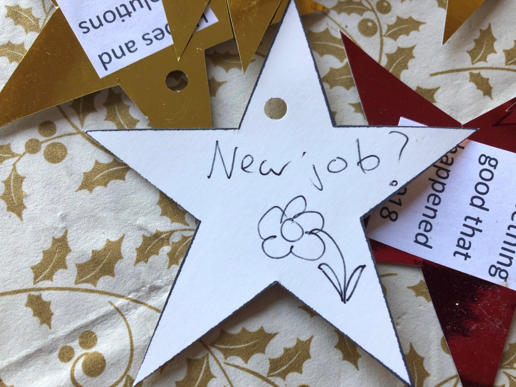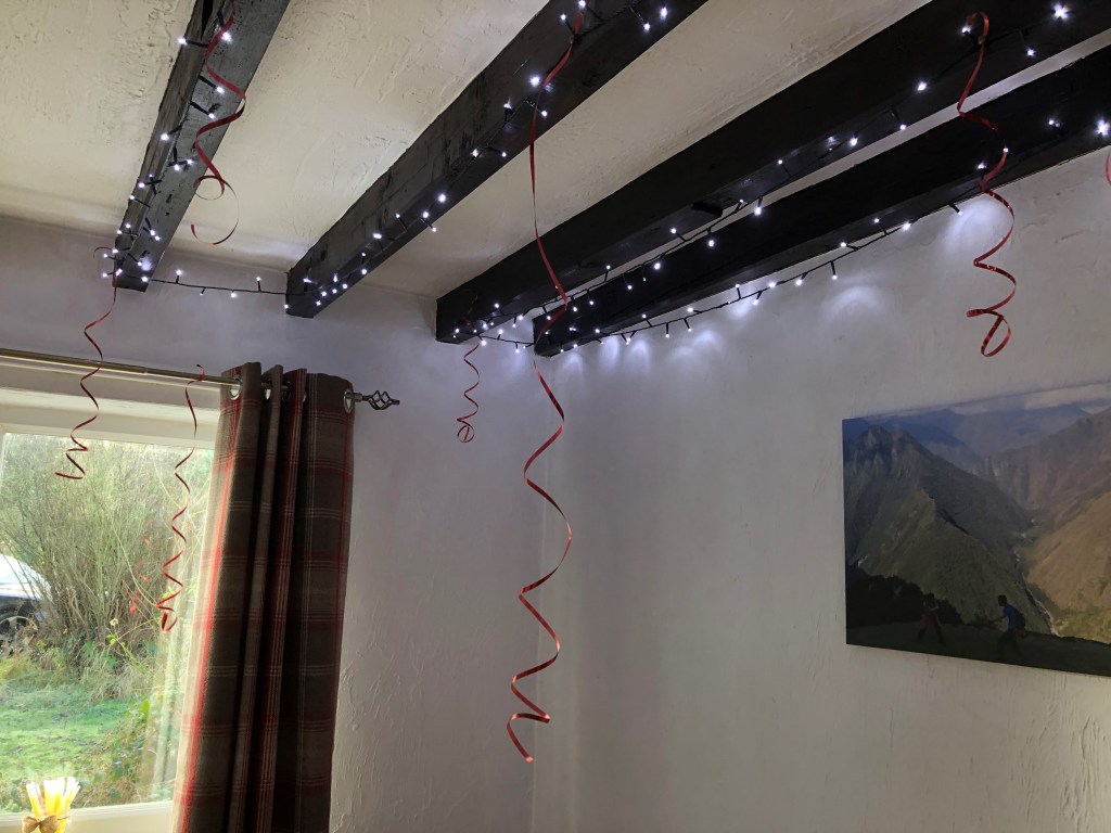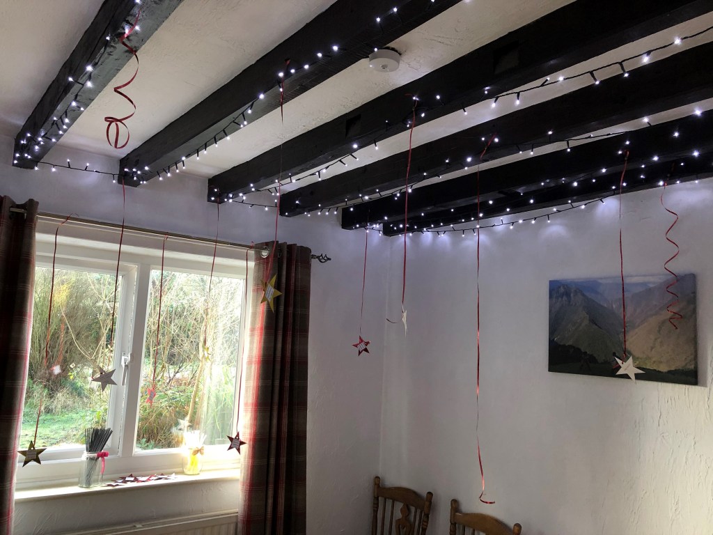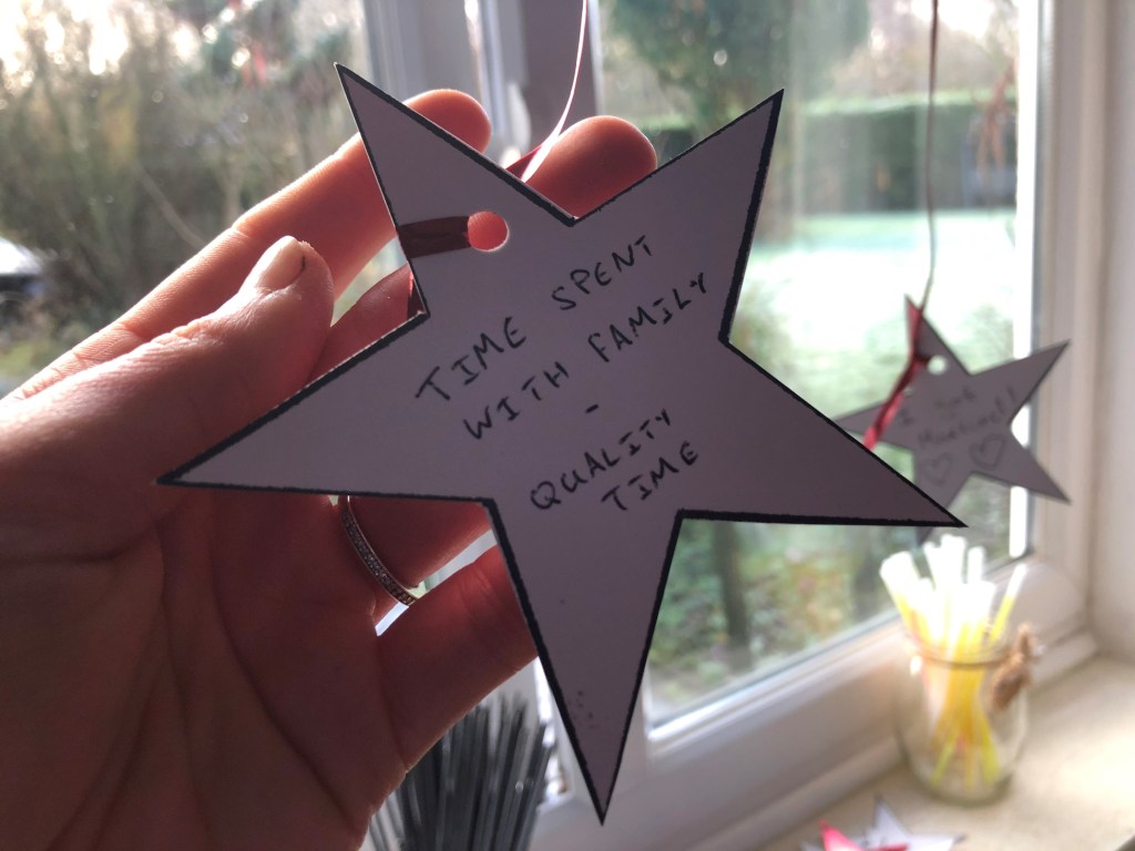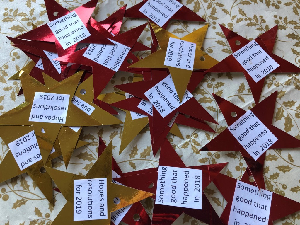 At my party a few years ago, I pinned curling ribbon into the ceiling with drawing pins (my fairy lights were hooked round them too) before any guests arrived. The ribbons looked great hanging down, and when people had written on the back of a star, they just tied them on to a ribbon. So by the end of the night, the room was filled with stars hanging down from the ceiling, full of good memories, hopes and resolutions for us to dance under. It was lovely. You could, of course, hang them on your Christmas tree or from curtain poles to make a feature in a window if you don’t want to put pins in your ceiling. I have beams, so I pinned into them and didn’t damage any plaster.