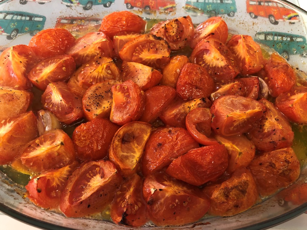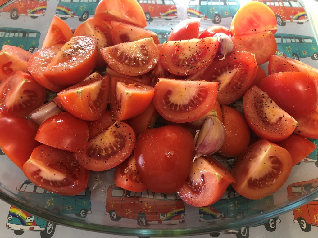 • Cut the tomatoes into quarters and place them in a large oven-proof dish with the garlic, salt, pepper and 4 tablespoons of oil.