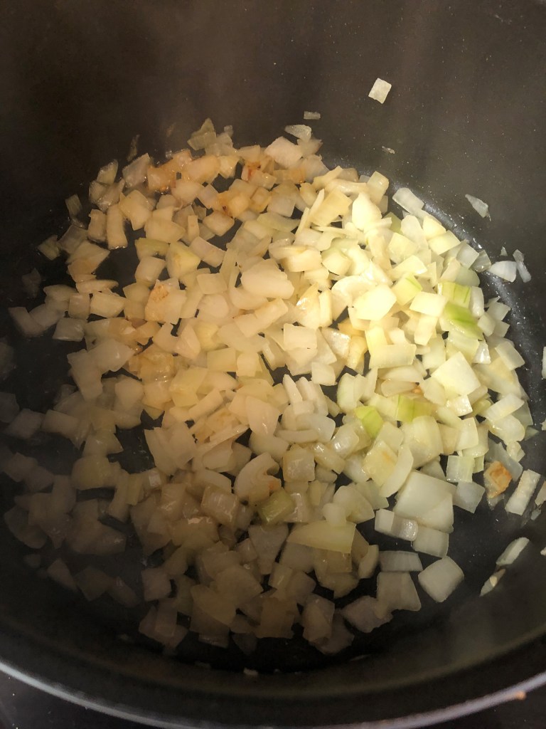 • Put a large pan on a medium/high heat on the hob and add a tablespoon of olive oil and the diced onion.