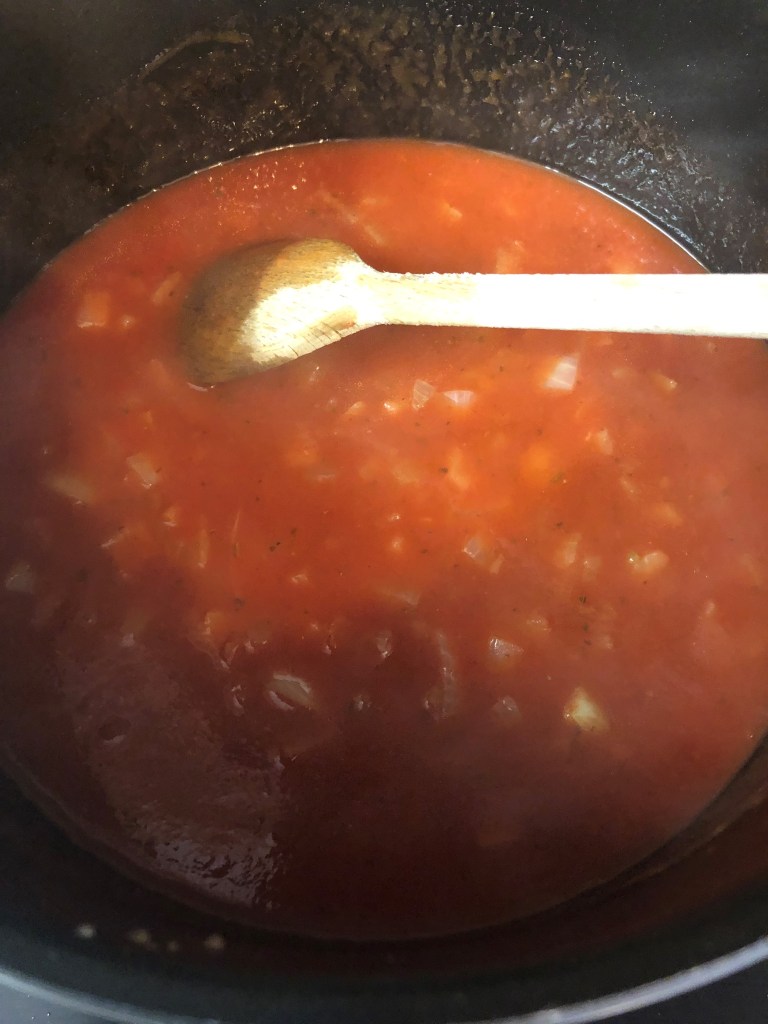 • Bring to a simmer, then add the roasted tomatoes, juice and all. But not the garlic cloves.