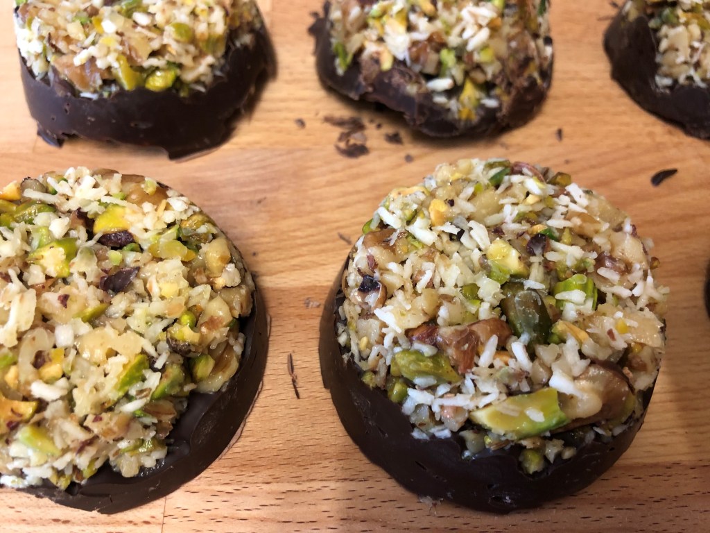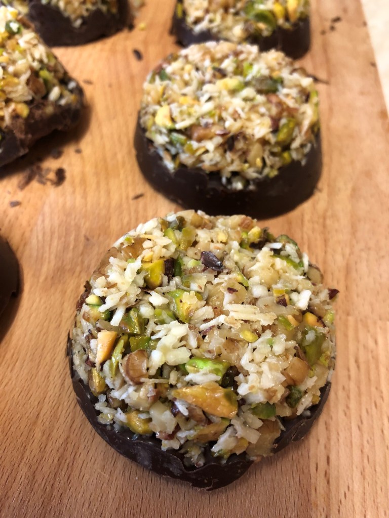 I don’t use any crazy ingredients in my recipes. If I can’t easily find it in my local supermarket, I don’t cook with it. So many times, I’ve found a recipe online that really appeals to me, but when I go to make it, I need the dehydrated sap from a rare Columbian flower, or something equally as difficult and expensive to get hold of, and it puts me off. So don’t let how healthy this snack is fool you into thinking this recipe is going to be complicated, it really isn’t. I use honey instead of sugar for sweetness, pistachios and walnuts for a lovely crunchy texture, desiccated coconut to cancel out some of the bitterness of the smooth dark chocolate and a small amount of unsalted butter to combine it all. That’s it. You probably have most of the ingredients in your kitchen already. So even if you’re not following a low carb, low sugar diet, give this a go and snack away guilt free.