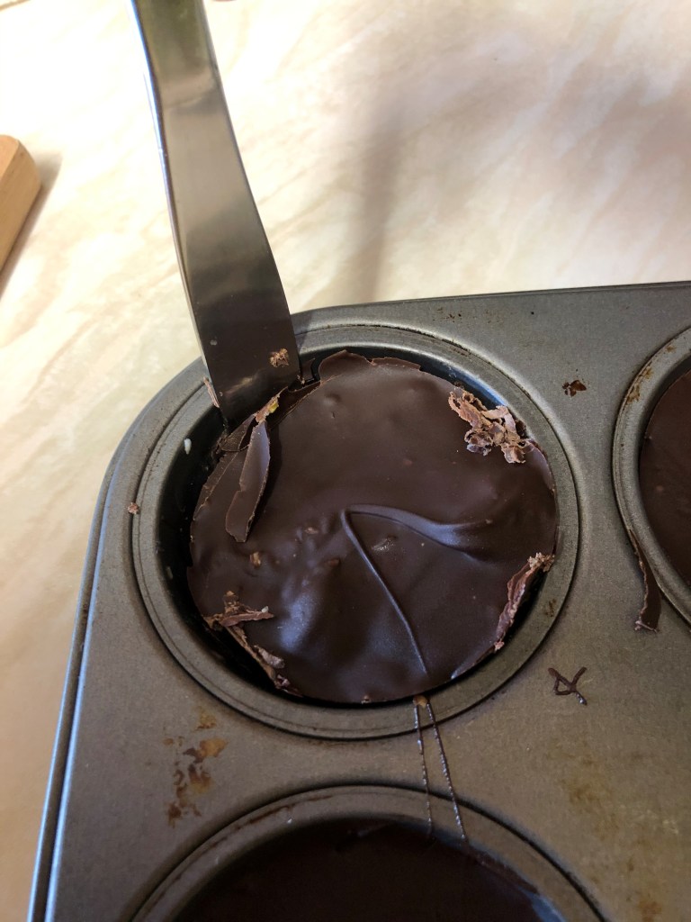 - Let the chocolate set completely in the fridge, then run a blunt knife down down the edge of each treat before turning out.