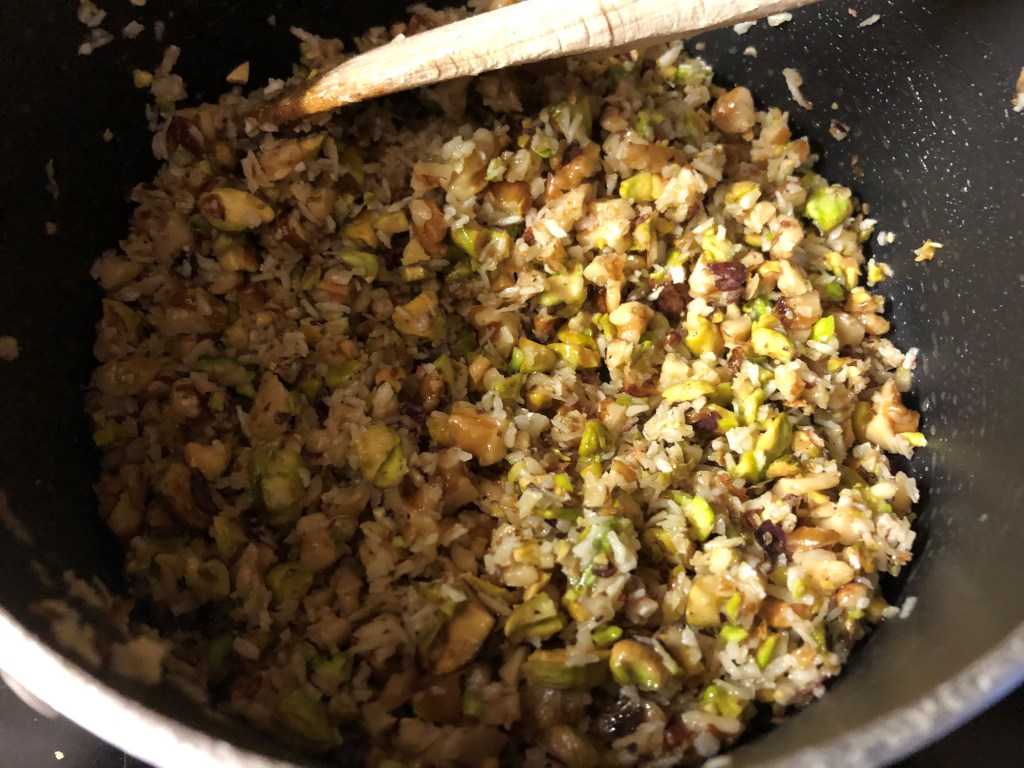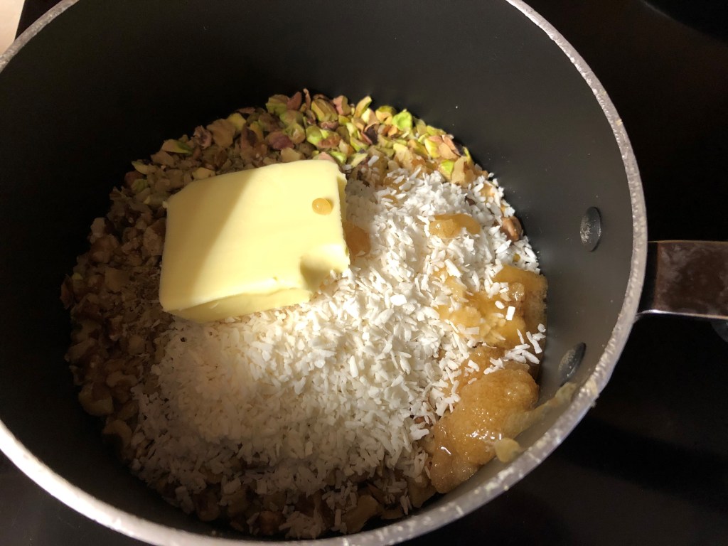 - Put the chopped nuts, butter, coconut and honey in a pan and melt over a medium heat.