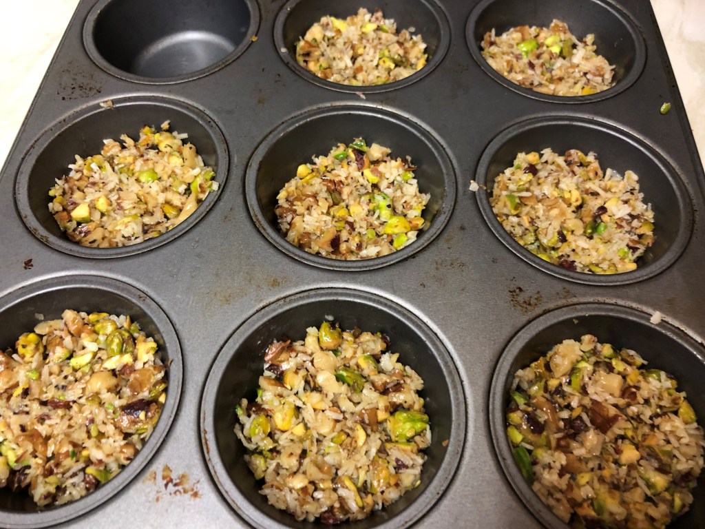 - Once the butter has melted and all the ingredients are well combined, take off the heat and spoon the mixture into greased muffin tray segments and push it down with the back of a spoon to compress it slightly.
