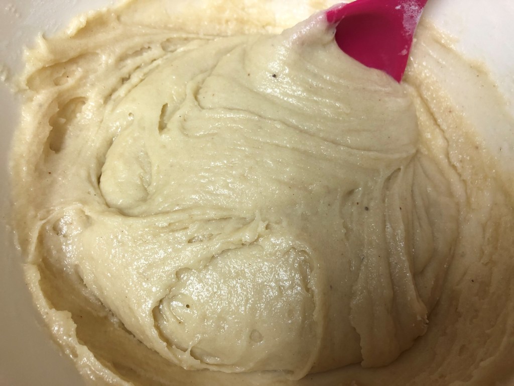 - Sift in the flour, baking powder and nutmeg, then add the sugar and mix well.