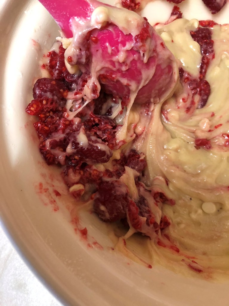 - Add the raspberries to the bowl and crush them slightly with the back of your spoon, then fold them in to the mix to create a marbled effect. Don’t mix them in completely.
