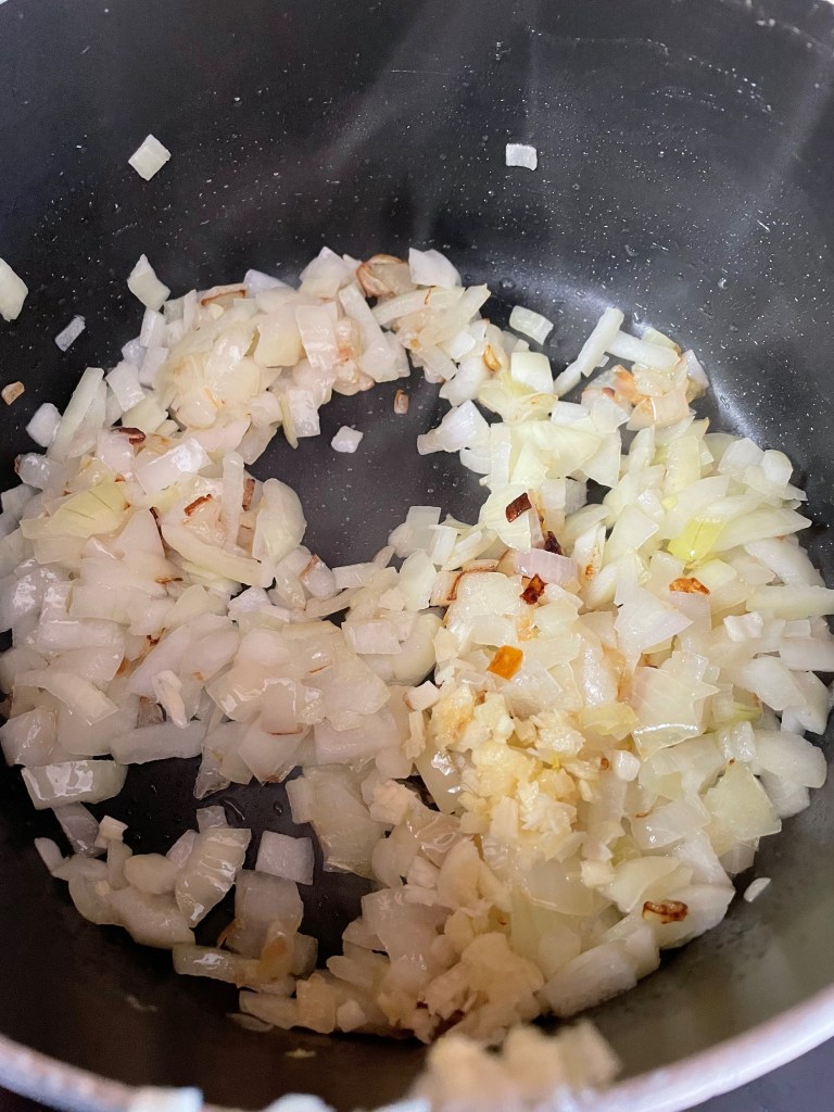 - Put a pan on the hob over a medium heat and add the oil and onions.