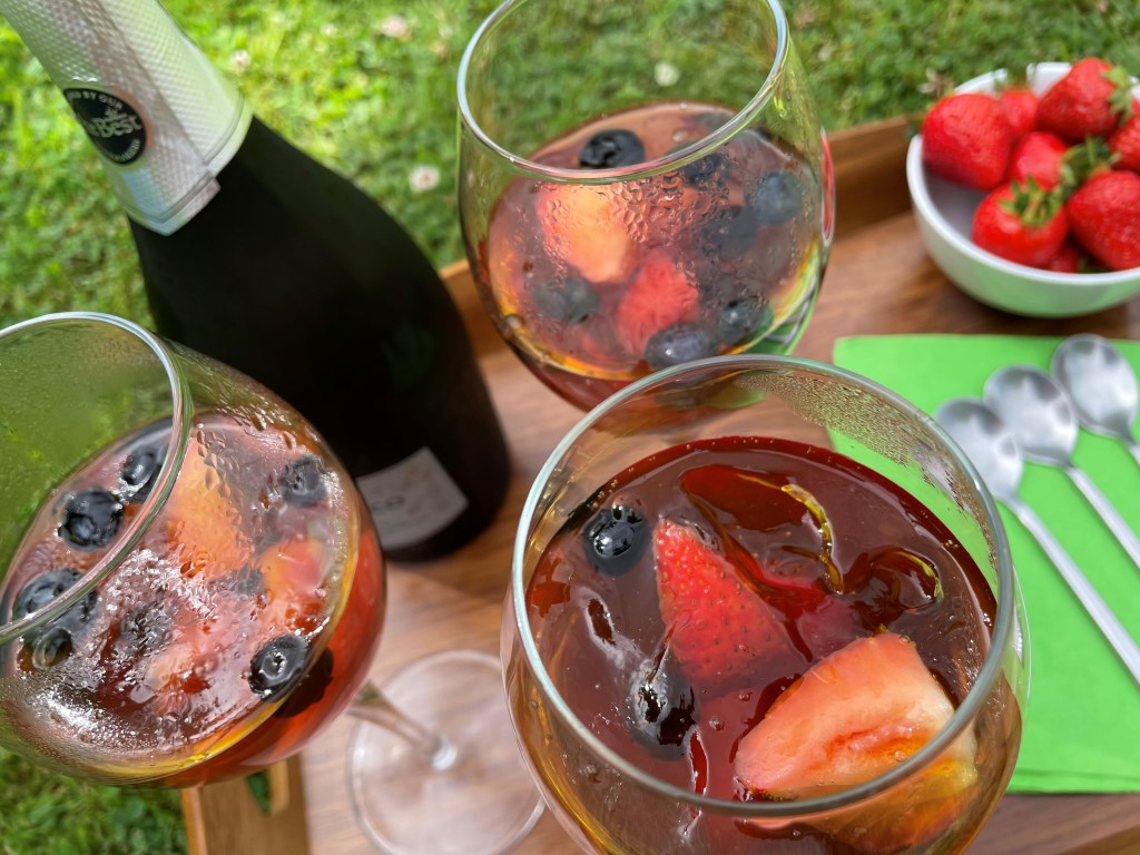 - Drop a handful of fruit into the bottom of 4 glasses, remove the mint, and pour the jelly mix on top. Only half fill the glasses, you need to leave room for the prosecco.