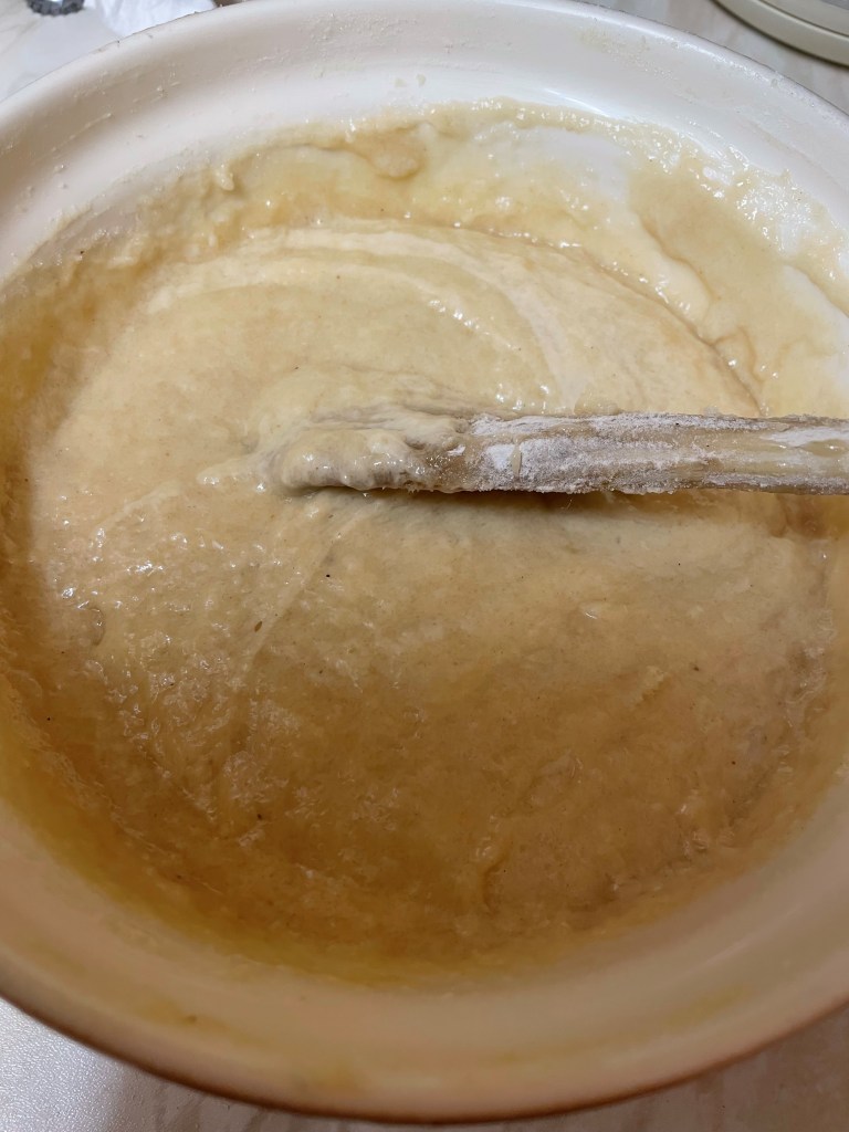 - Sift in the flour, baking powder and ginger and mix well.