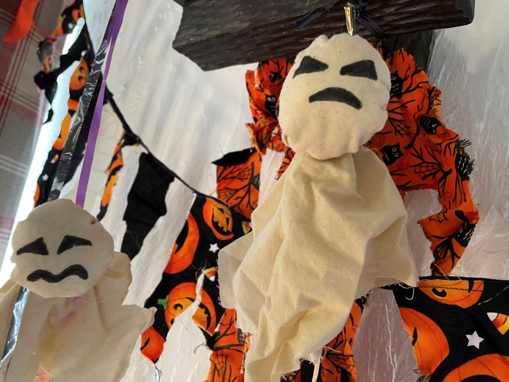 - Leave one piece of ribbon long to hang your ghost from, and cut the other one short.
