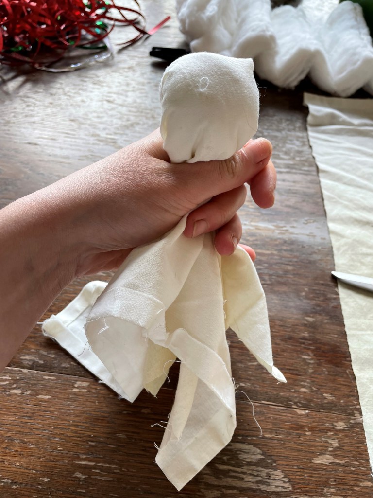 - Put a ball of cotton wool in the middle of the square and gather up the fabric around it.