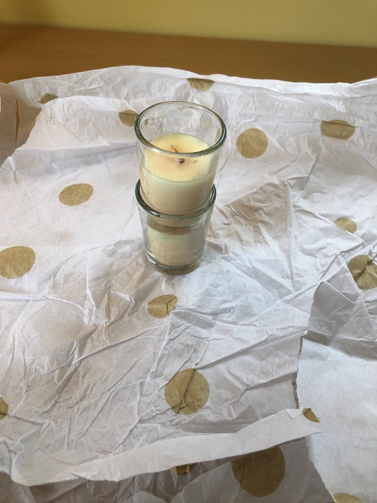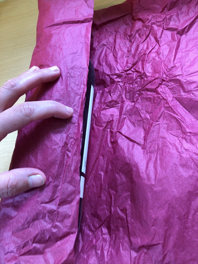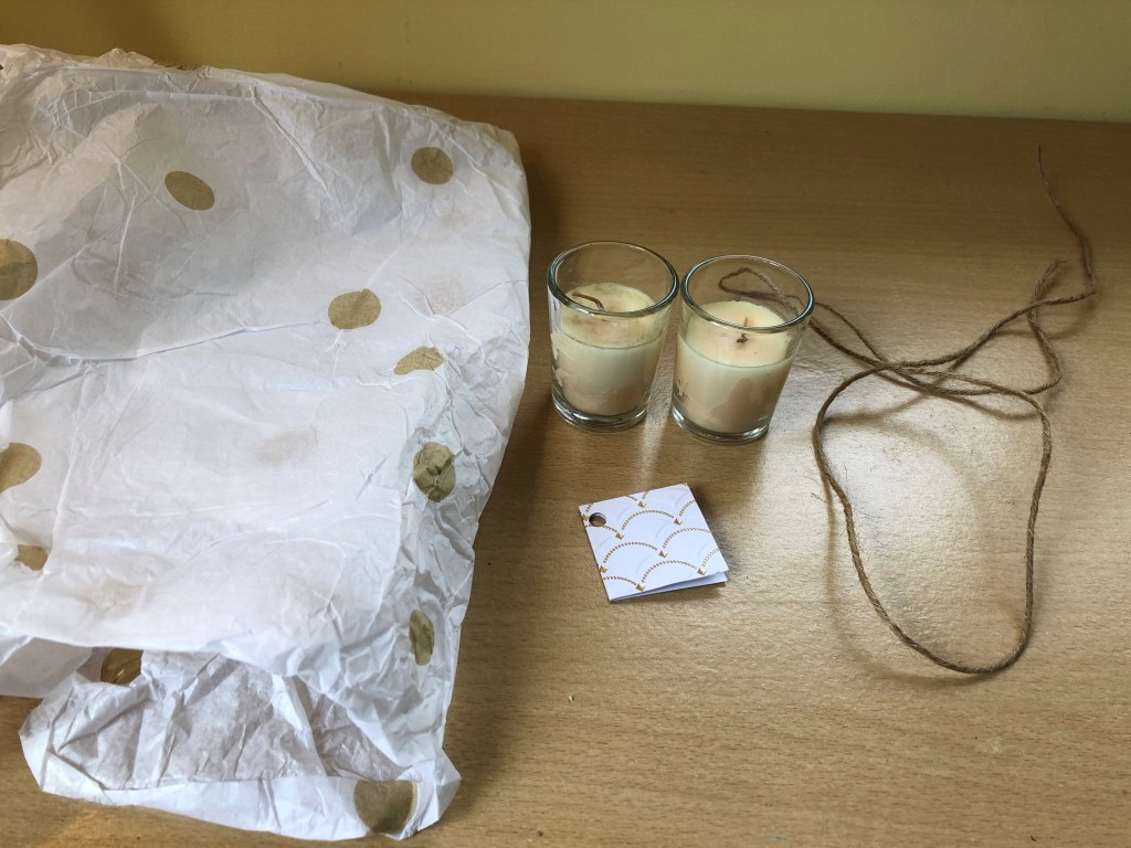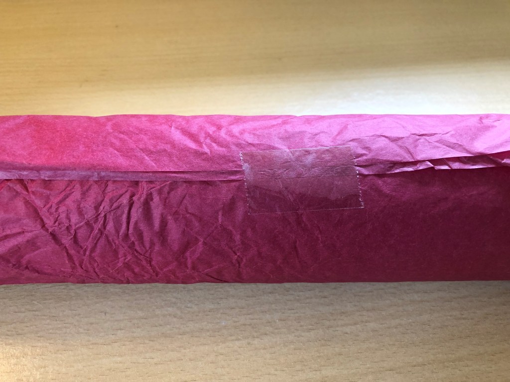 Next, on my green wrapping journey, I experimented with tissue paper. A lot of tissue paper is recyclable or even compostable, and if you shop at independent retailers, quite often, your item are wrapped in tissue paper. So I wanted to try to reuse some.