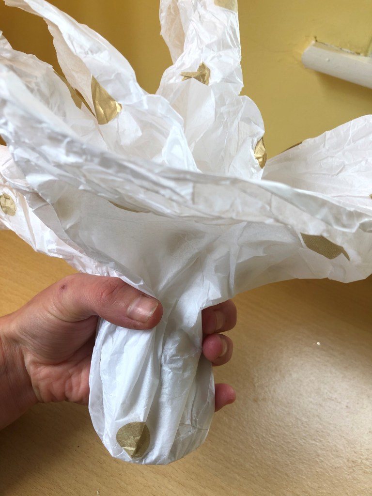 Thread a longer piece of string through the knotted string and wrap the longer string around the neck of the bottle a couple of times, before knotting it securely. (make sure the cellotaped edge of the tissue paper is at the back.)