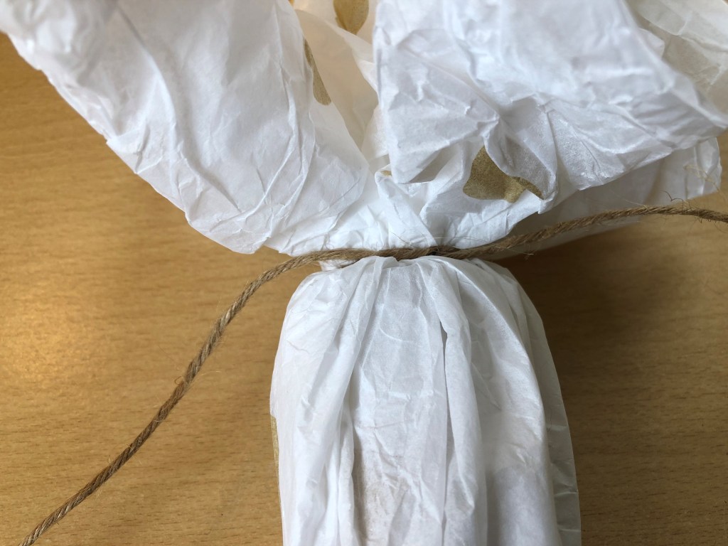 Lay your tissue paper out flat, place your items in the middle, then gather the paper up around it and tie it tightly at the top with the string.