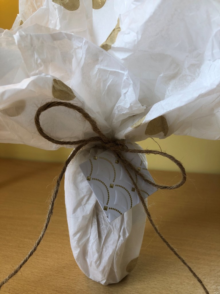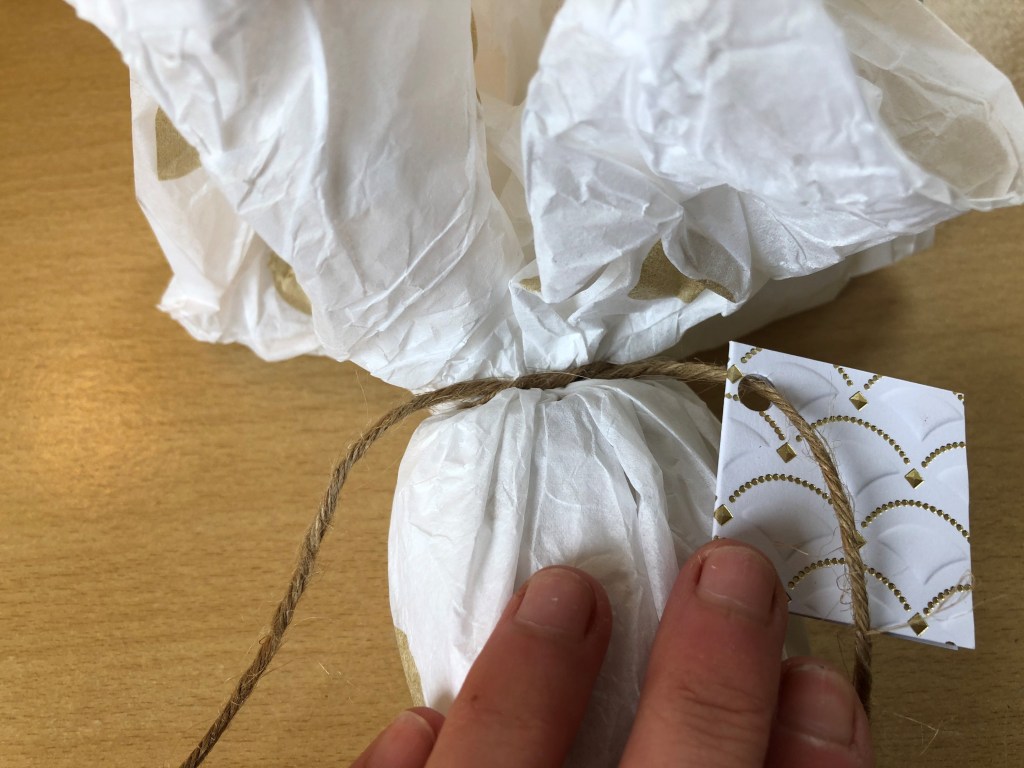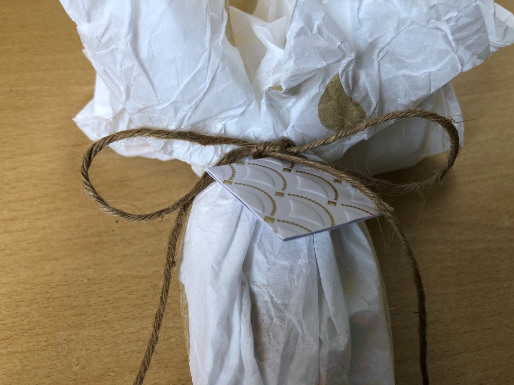 But as I’m trying to go a bit greener, this year, I’m using tissue paper, natural string (which is biodegradable) and a recycled gift tag.