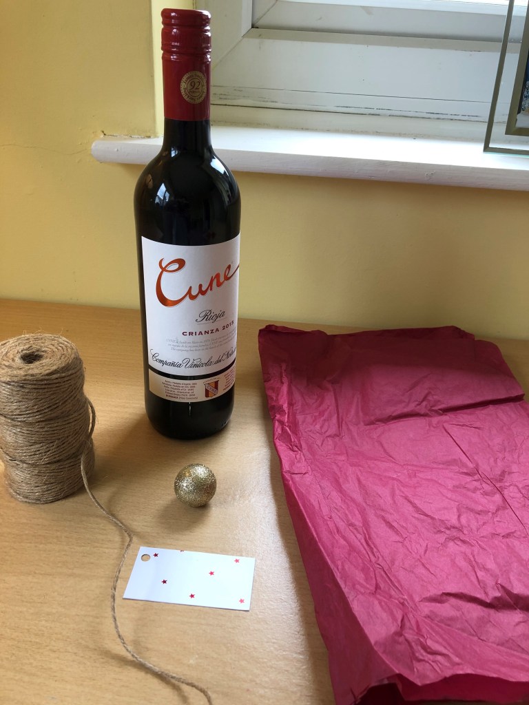 So instead, I’ve used tissue paper, string, a recycled gift tag, and just to make it look a bit more special, I’ve added a mini bauble to hang next to the tag. I think it looks really cute and inviting, and is probably going to be how I wrap all bottles from now on.