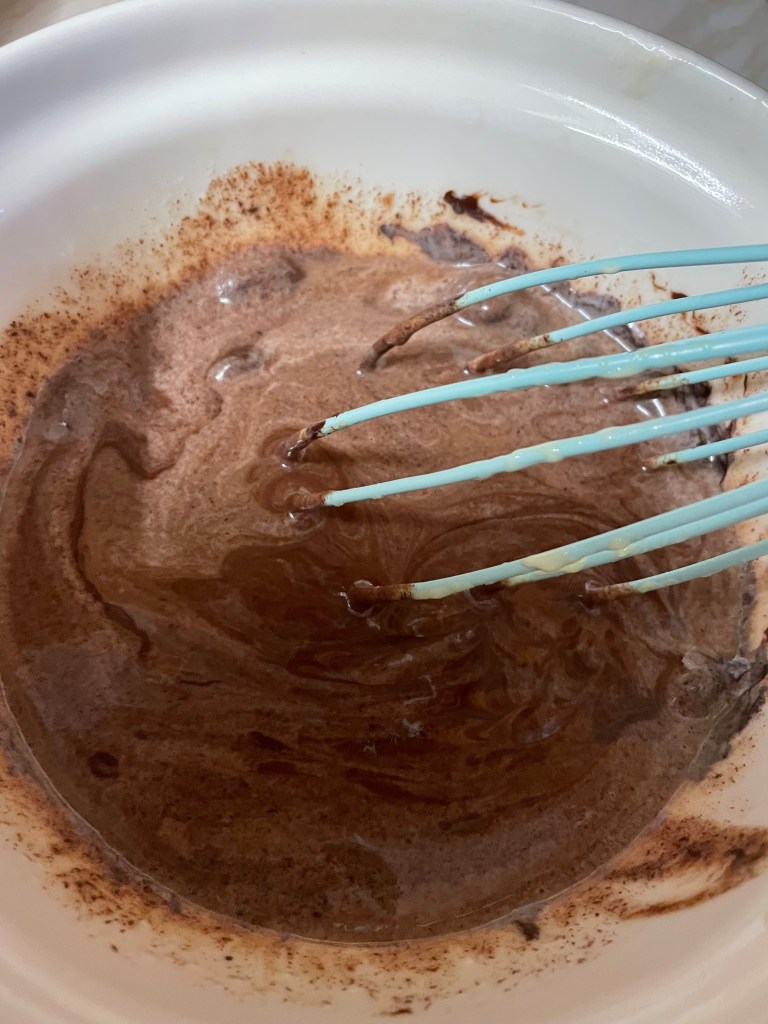 - Whisk 150mls of double cream to soft peaks, then mix in the cocoa powder.
