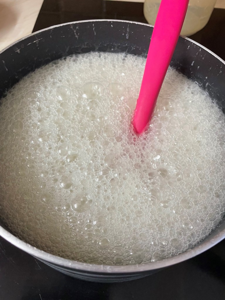 - Uncover and boil for about 5mins, stirring every so often, until a small amount of the mixture dropped into cold water forms a soft ball when rolled gently between your finger and thumb. (or, if you’re using a sugar thermometer, you reach 115c)