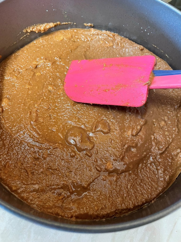 - Pour the mixture into the bottom of a cake tin and spread out evenly.