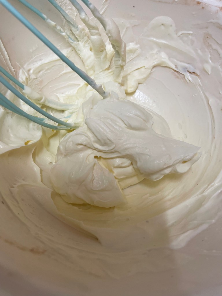 - In a separate bowl, mix together the cream cheese with 150g of caster sugar.