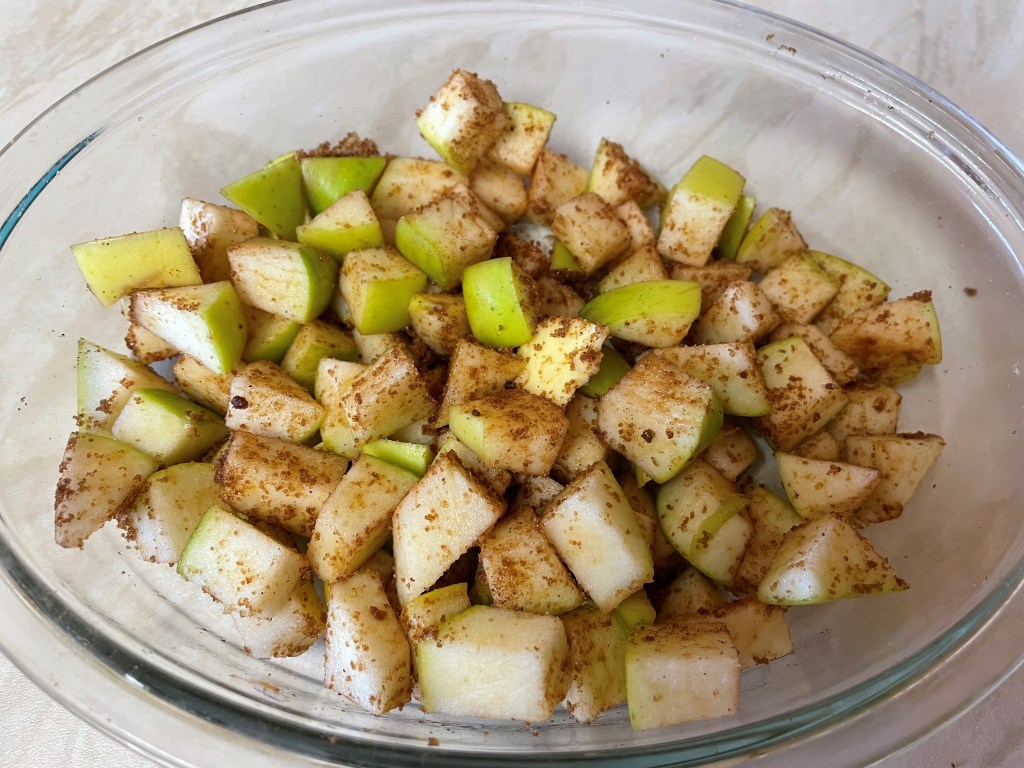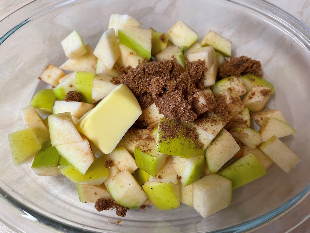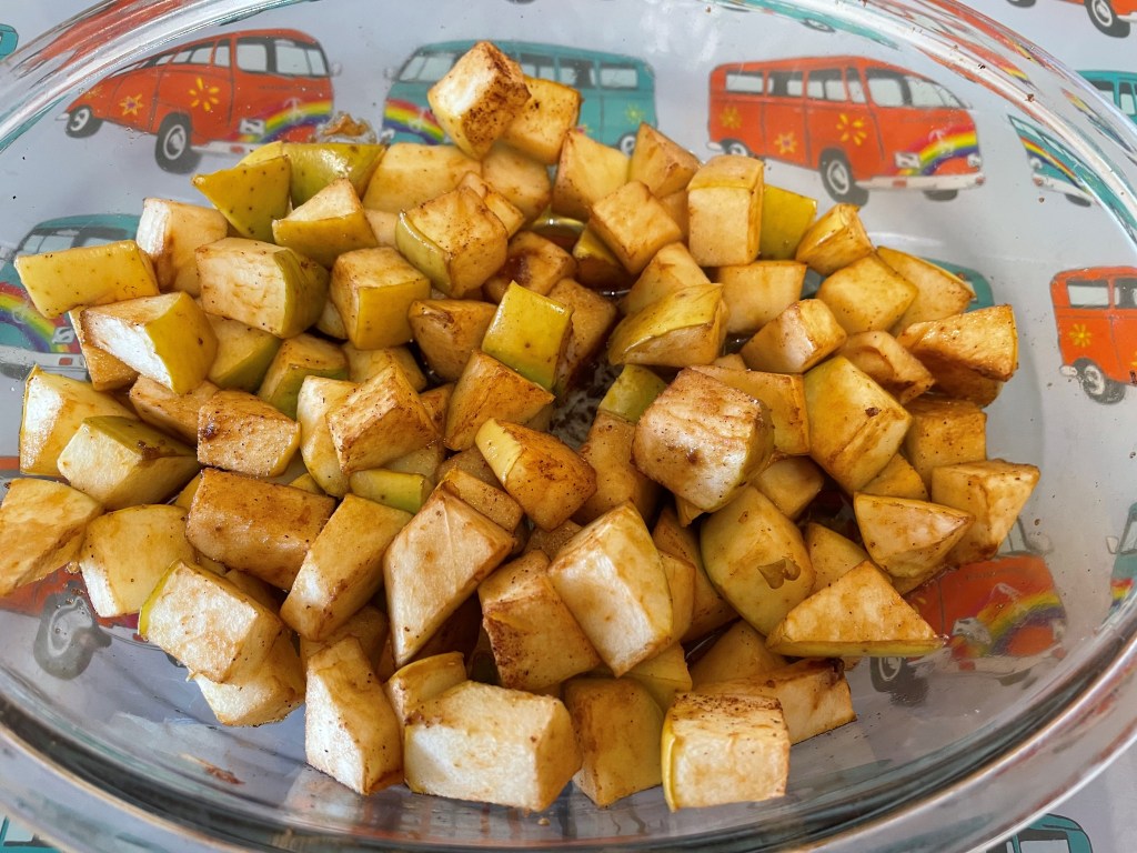- Put the apple in an oven proof dish and add the butter, the tablespoon of dark brown sugar and the mixed spice and mix well so the apple pieces are well coated.