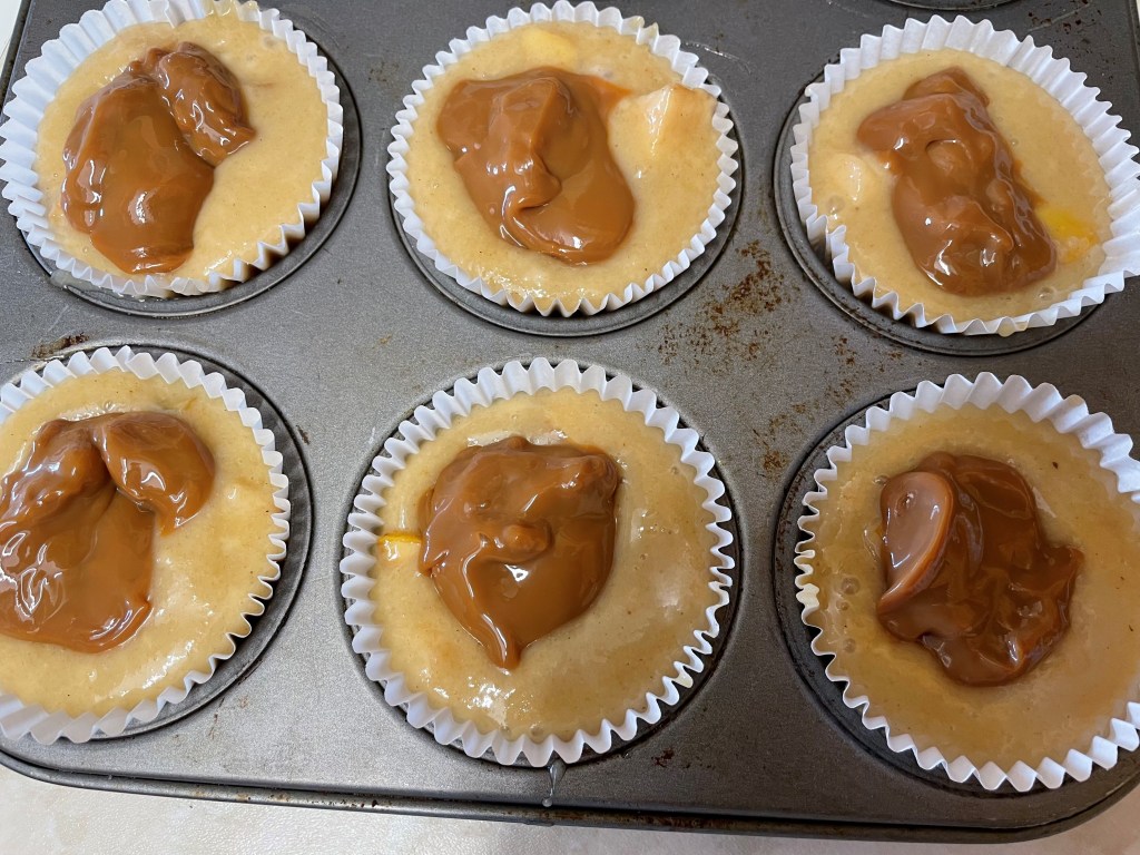 - Place a heaped teaspoon of caramel in the centre of each filled muffin case, and using a toothpick or skewer (I used a chopstick), swirl the caramel into the centre of the muffin mixture.