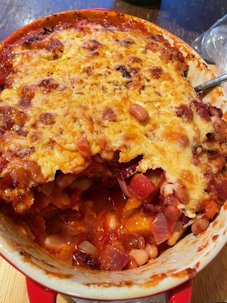 I love roasted butternut squash. I usually chop a full squash into chunks and roast it in oil, seasoning and garlic, then keep it in an air-tight container in my fridge. I can then add it to pasta dishes or use it top pizza with, or microwave it for a few mins so it’s hot and have it as part of a salad or in a wrap with fried peppers, onions and fajita seasoning. Or, when I need a bit of comfort food, I make this. This Butternut Squash and Bean Bake is perfect for this time of year. It’s warming, easy to make, and really satisfying. It makes the perfect side to quiche (trust me on this), seasoned chicken, veggie burgers, with a jacket potato or a simple mixed leaf salad and crusty bread for a yummy hot lunch.