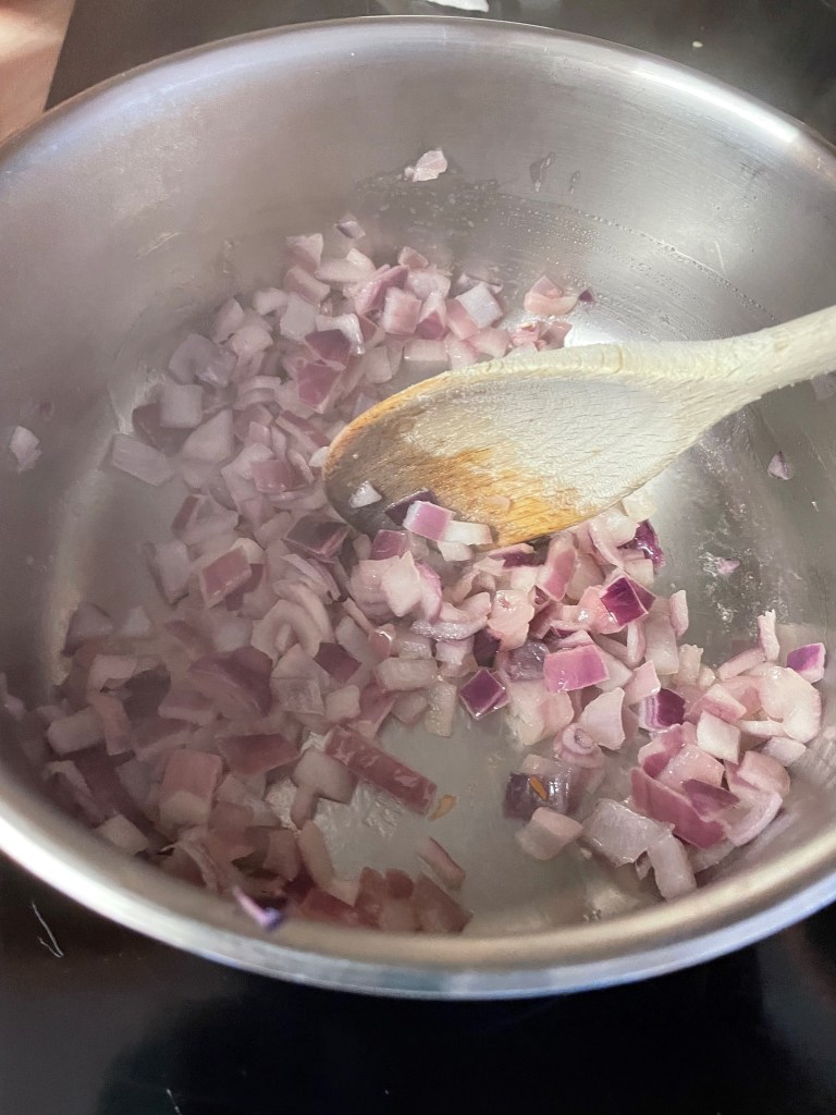 - Meanwhile, place a pan on the hob over a medium heat and add the rest of the oil and diced onion.