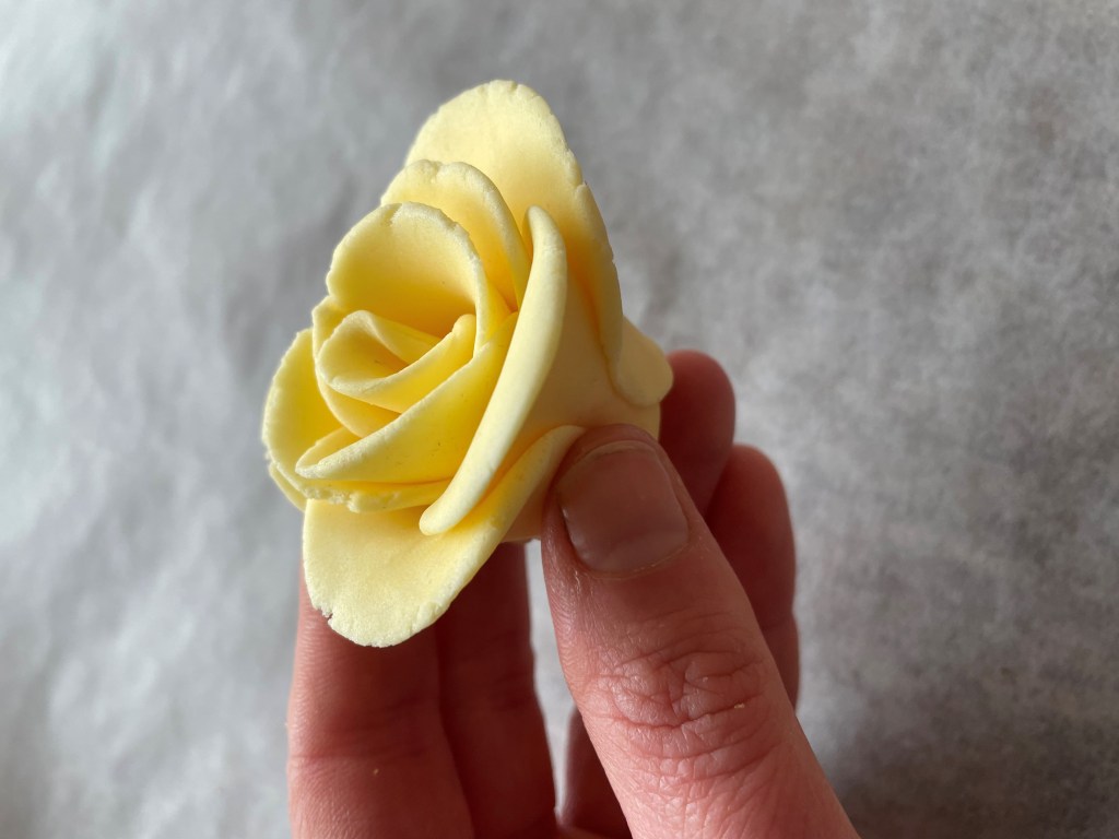 - As your rose gets bigger, flatten the top edge of your petals slightly, by pinching them between your thumb and forefinger, and ease them away from the centre to open it up.