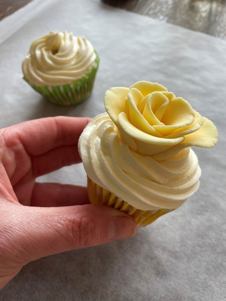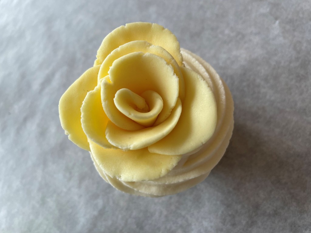 - Once your rose is large enough, pipe a generous amount of buttercream onto a cupcake, or pipe a dollop onto a larger cake, where you’d like your rose to go.