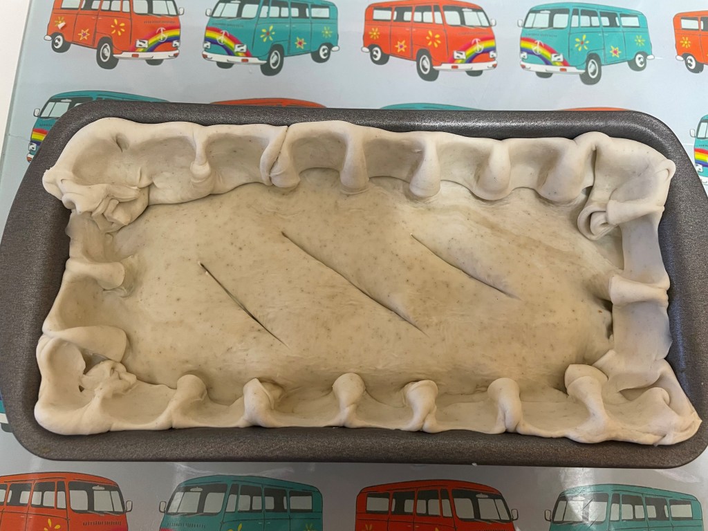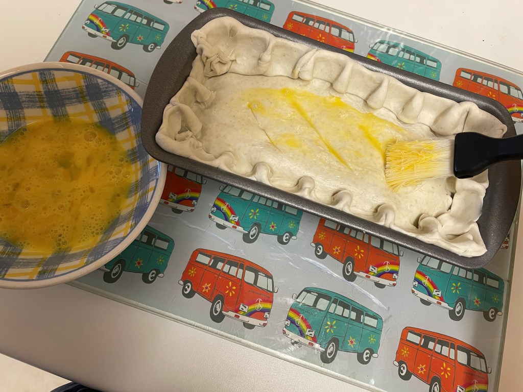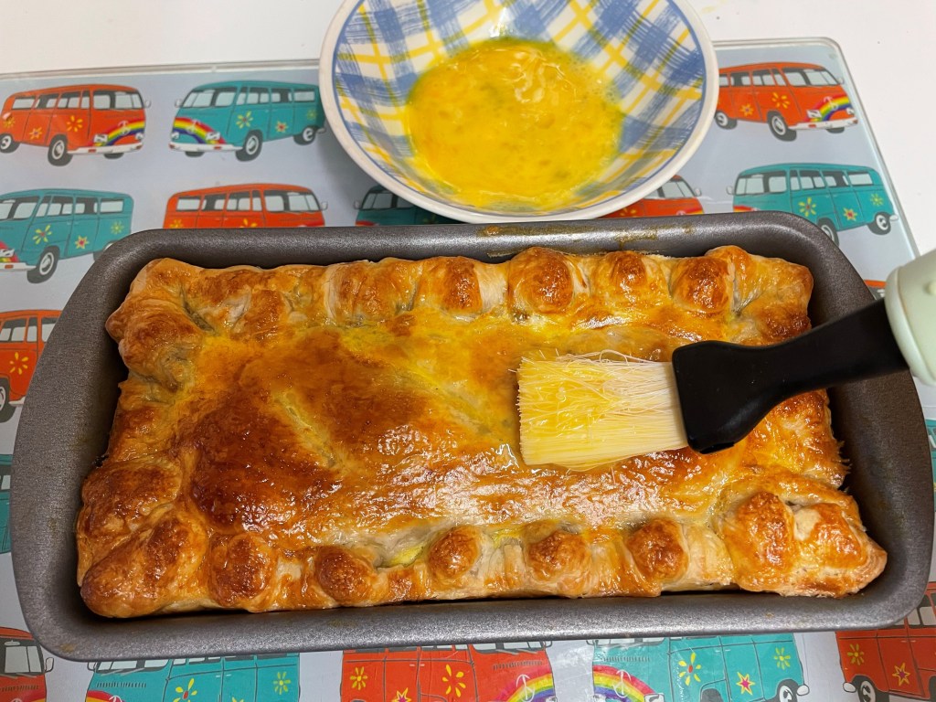 - Stab a couple of air vents into the top of the pastry and brush with the beaten egg.