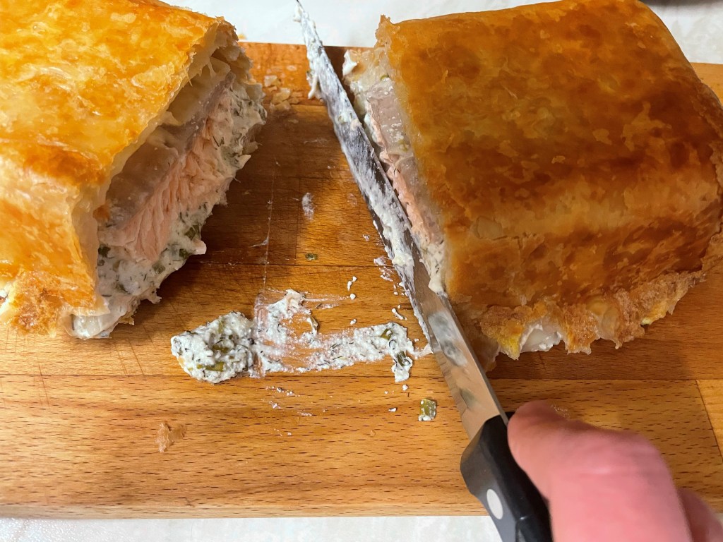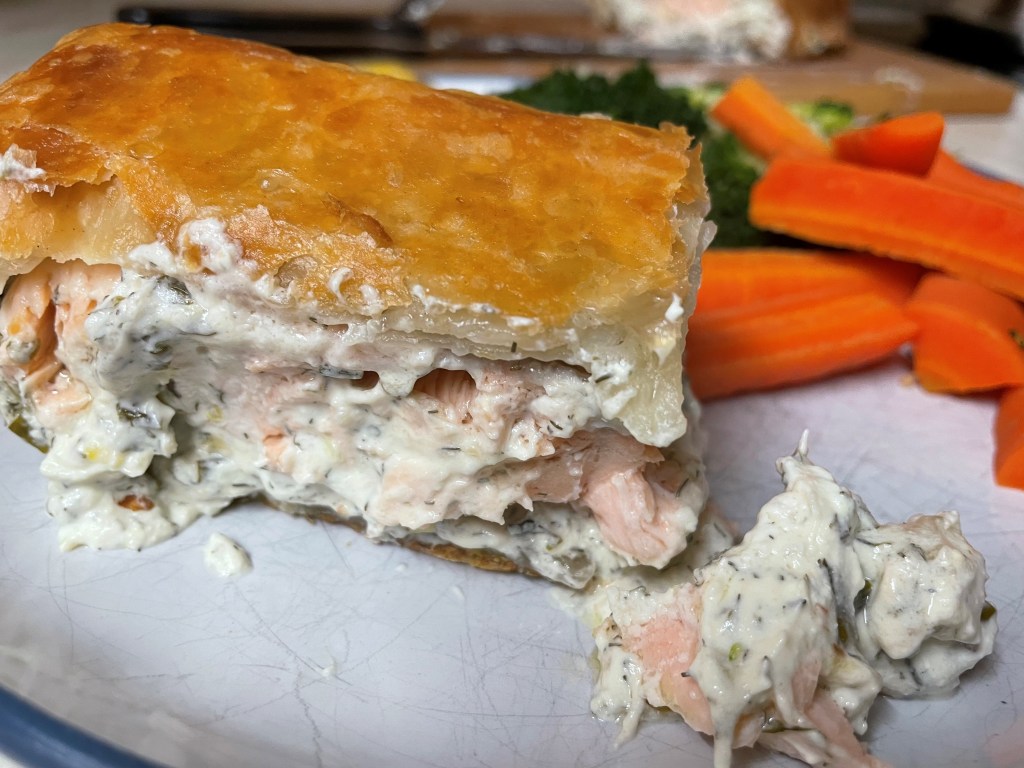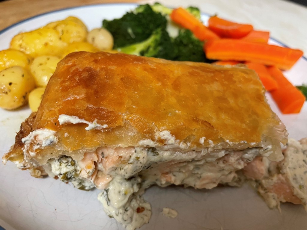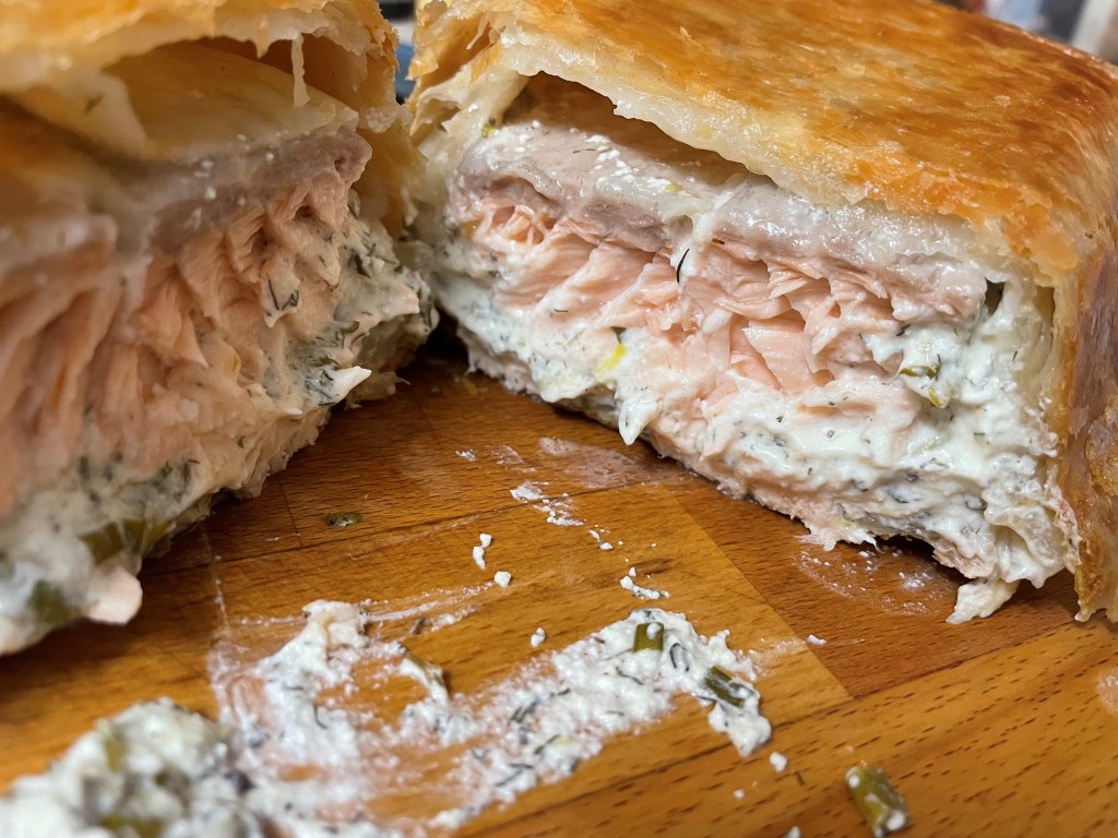 Crisp, buttery puff pastry surrounding flaky salmon and a creamy, herby filling with a hint of lemon.