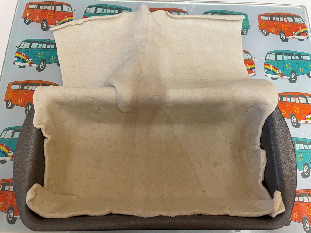 - Lay your sheet of puff pastry across the opening of the tin, then gently ease it down into the bottom, making sure you don’t tear it. Push it into the corners, and make sure it covers the sides.