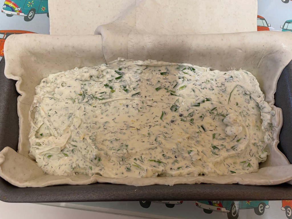 - Mix the rest of the ingredients (apart from the egg) together in a bowl and spread evenly over the salmon.