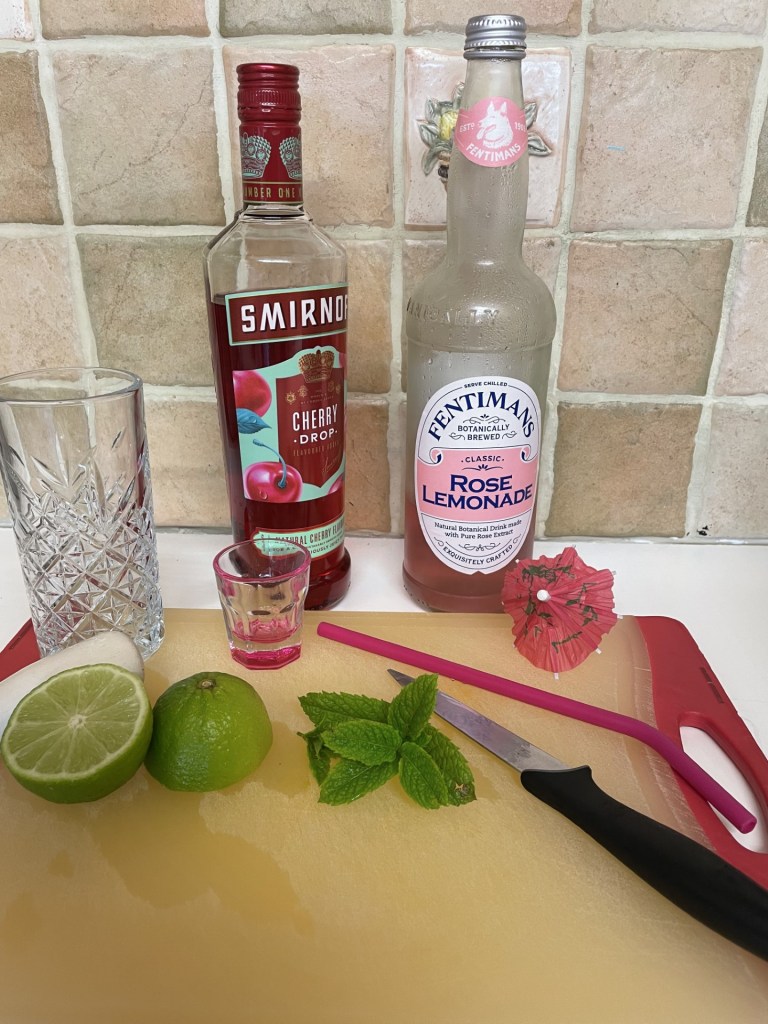 My friend Leah used to be a Cocktail Slinger, and knows SO many cocktail recipes off by heart. I message her sometimes, asking how to make particular cocktails, or occasionally, I just send her pictures of my drinks cupboard, or of bottles I’ve bought on a whim, then realise I don’t know what to do with once I get home. She always comes back with delicious suggestions. Recently, I bought a bottle of cherry vodka and a bottle of pink lemonade, as they were on a good offer at the supermarket. I sent her a message asking for inspiration, and this was what she came back with – a pink twist on a Mojito. It’s absolutely delicious, and really easy to make.