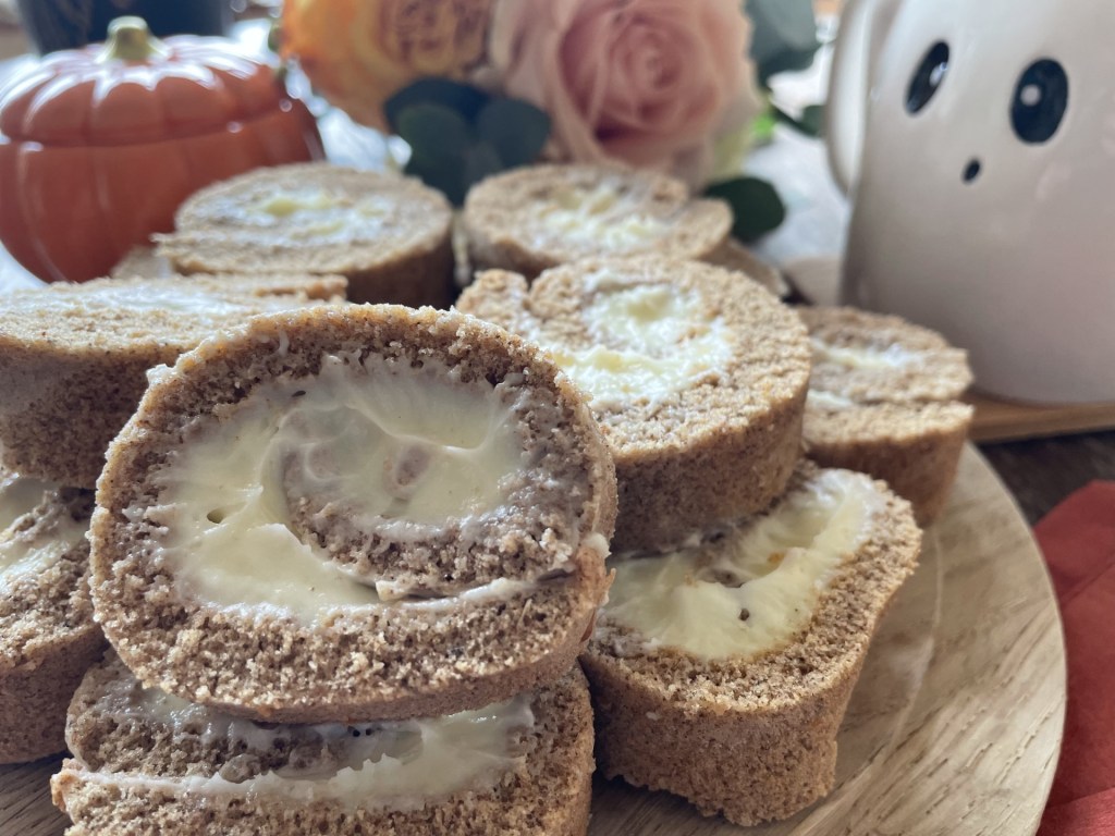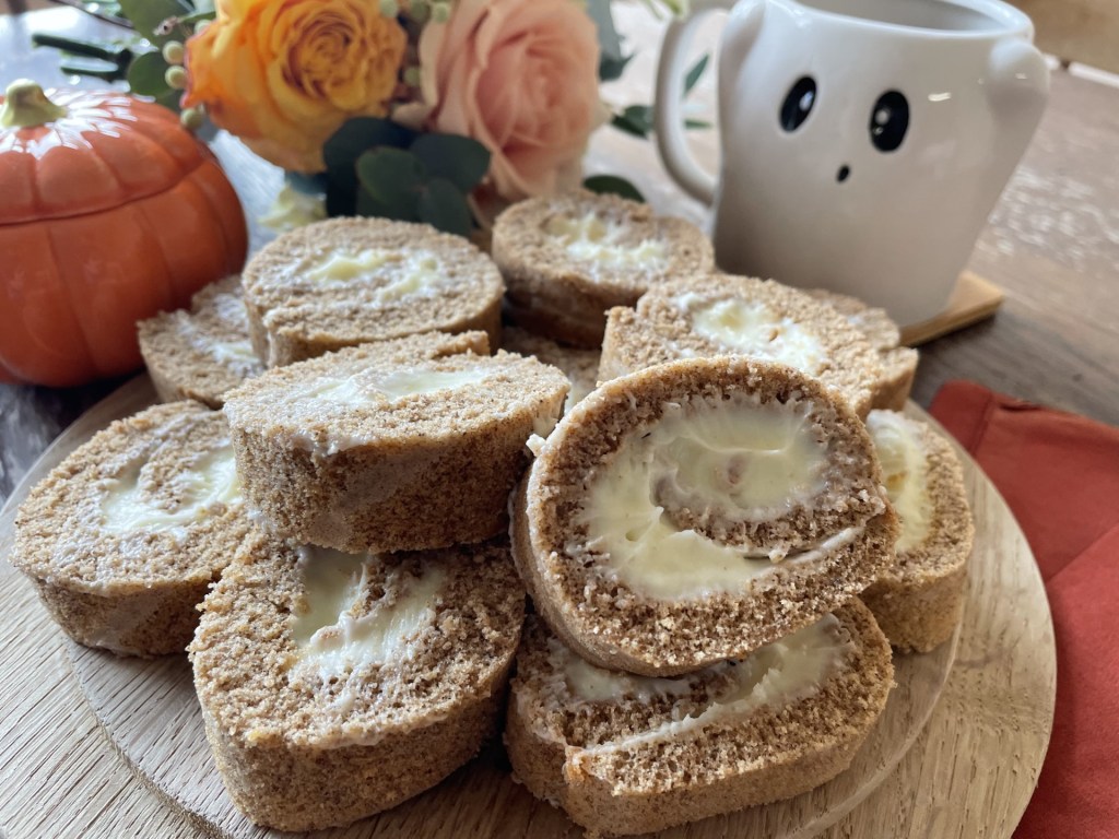 Pumpkin Spice is synonymous with coffee now, but it also makes for a delicious spiced cake. Here, I’ve used it to flavour a Swiss Roll sponge and filled it with a white chocolate cream cheese frosting, and the combination is delicious.