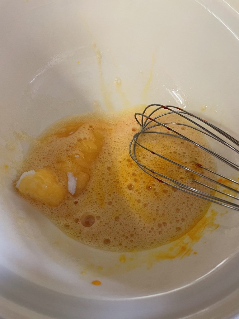 - Break the eggs into the bowl and whisk for 2mins.