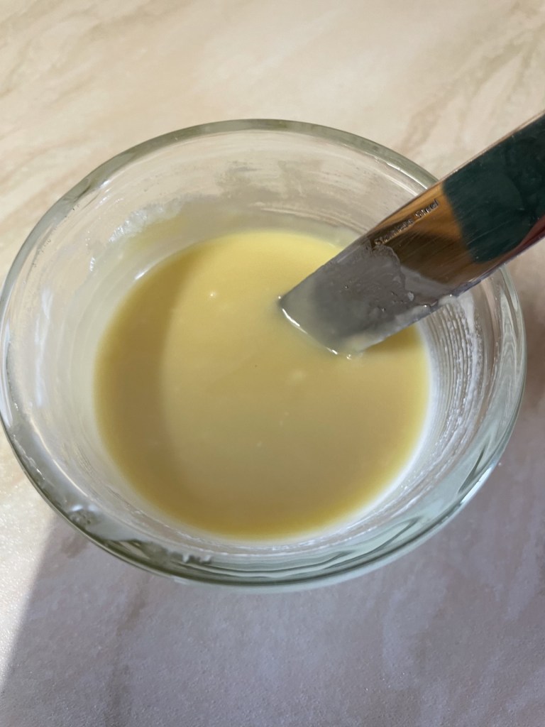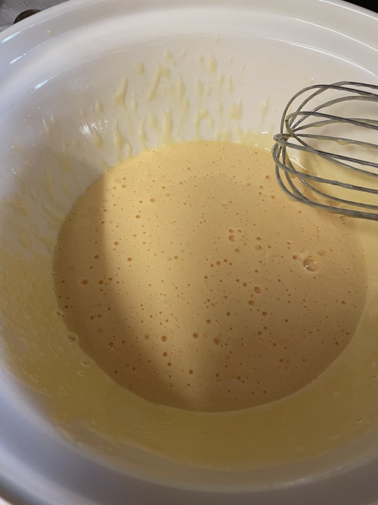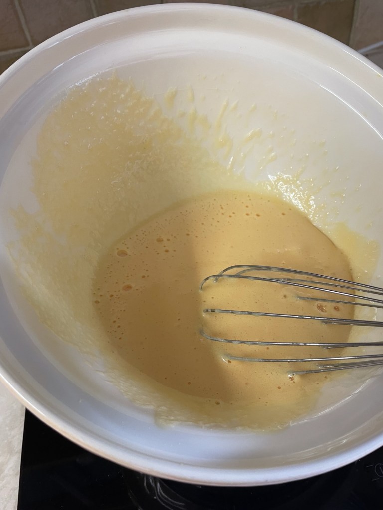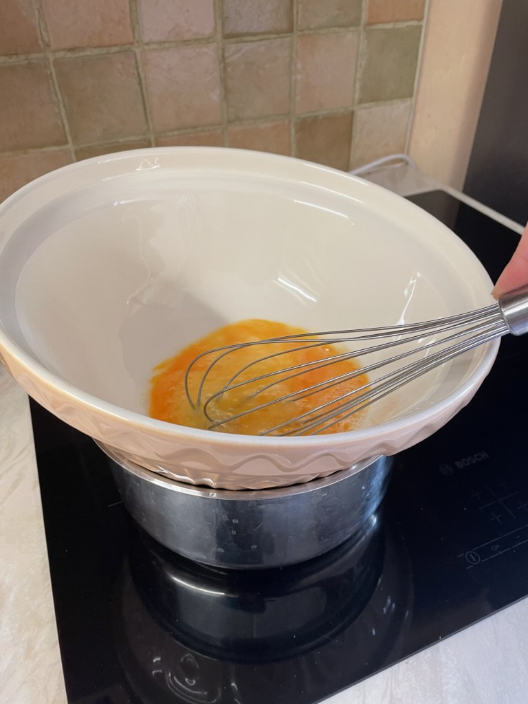 - Take the bowl off the pan and continue to whisk until cool.
