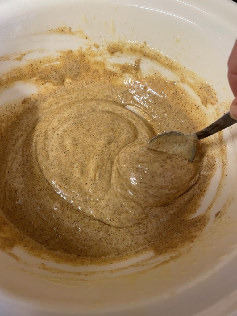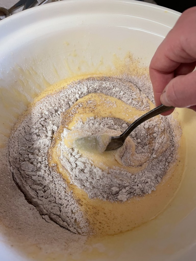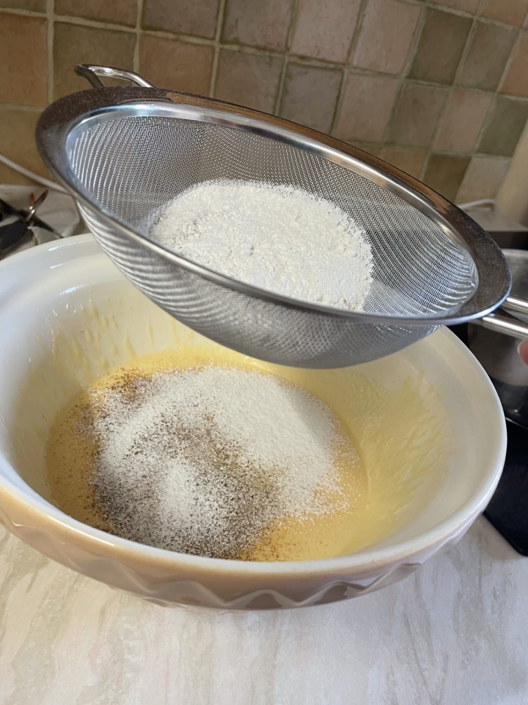 - Then sift the flour and spices into the egg mixture.