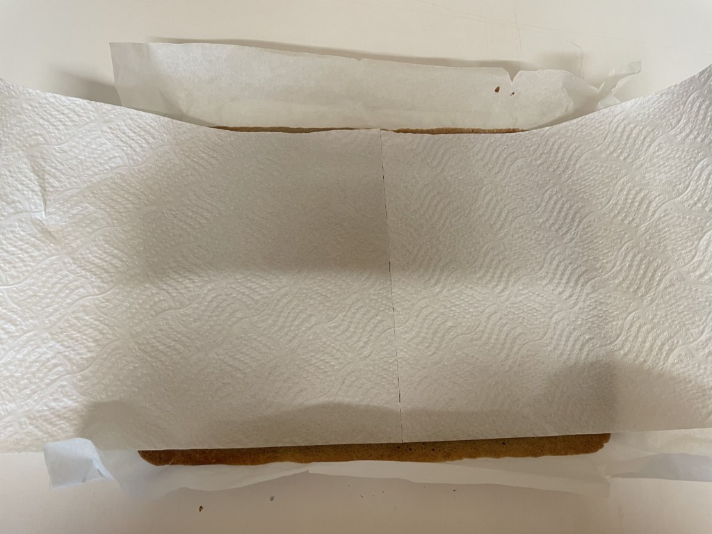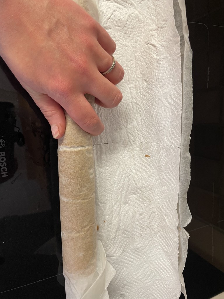 - Place clean, dry kitchen roll onto the top of the sponge so it doesn’t stick to itself and roll the whole thing up, starting on a long side.