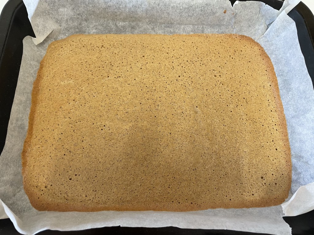 - Pour the mixture into your prepared tin and tilt it so it spreads into the corners. You want a square / rectangle shaped cake so you get a neat roll.