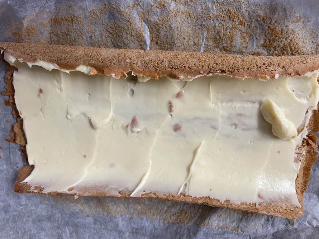 - Wrap the parchment back around the outside of the Swiss Roll to keep it held together and chill in the fridge for 30mins.