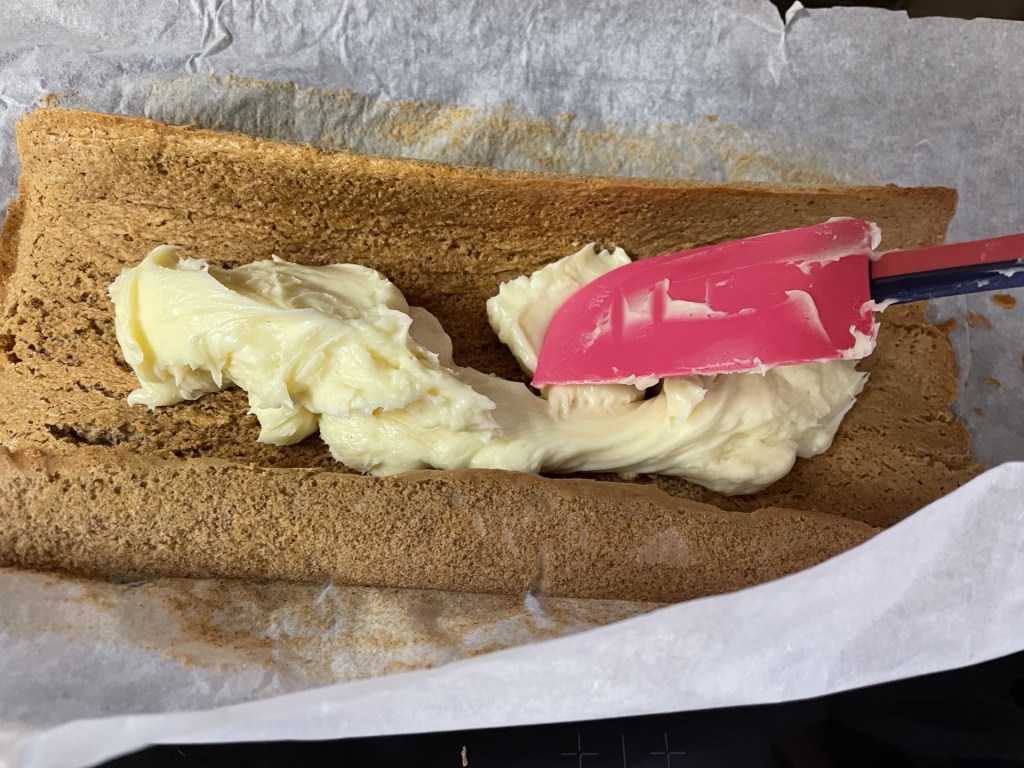 - Re-curl the sponge, trapping the frosting inside, peeling off the parchment as you do.