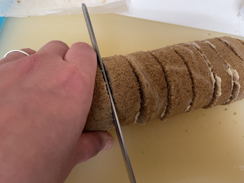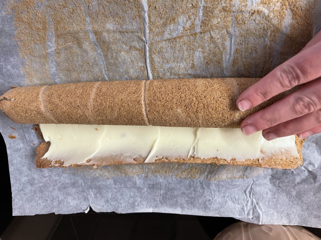 - Don’t try to peel the parchment off at this stage, just roll everything up into a sausage shape. The sponge will be hot, so be careful.