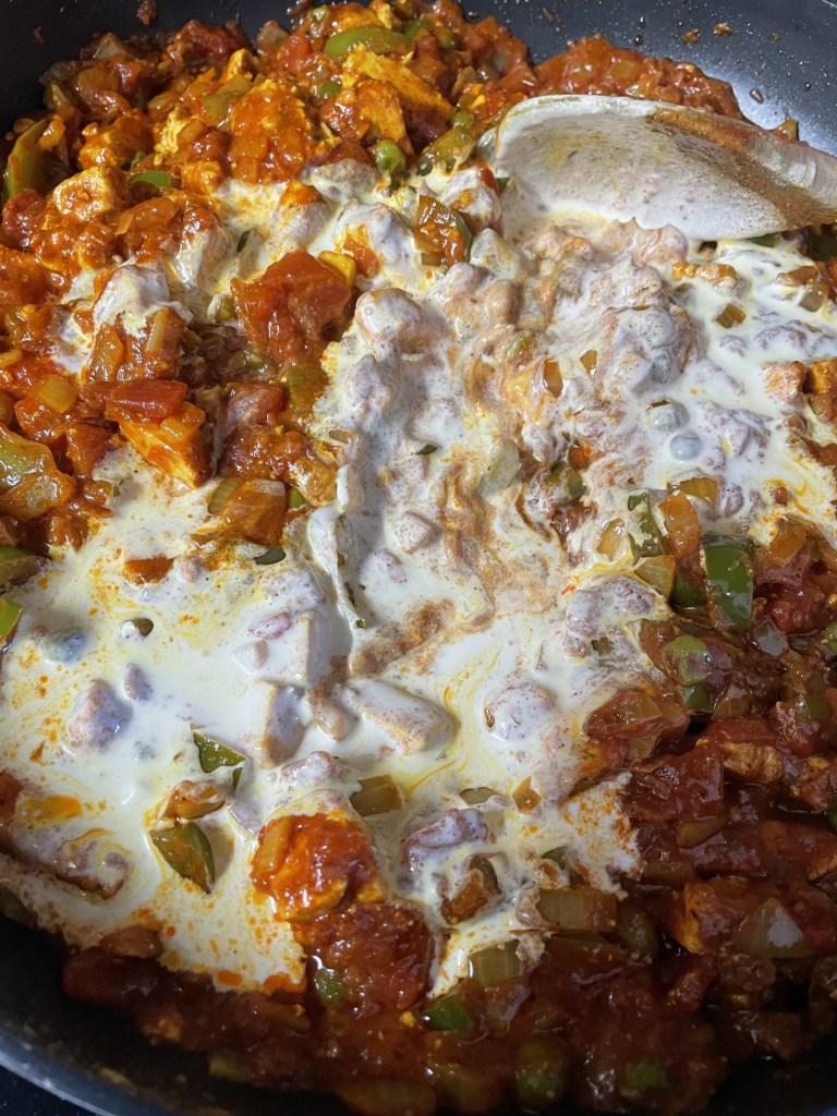 It’s usually served with chicken, but this is a vegie version, made with Paneer – an Indian cheese, instead. The Paneer doesn’t taste like cheese, it acts like tofu does in dishes – it soaks up all the lovely flavours and provides a different texture to the dish. Paneer can be found in the dairy section of most supermarkets.