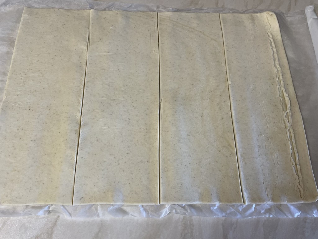 - Unroll the pastry on a clean surface, but don’t take it off the paper (Then you don’t need to worry about flouring the surface).