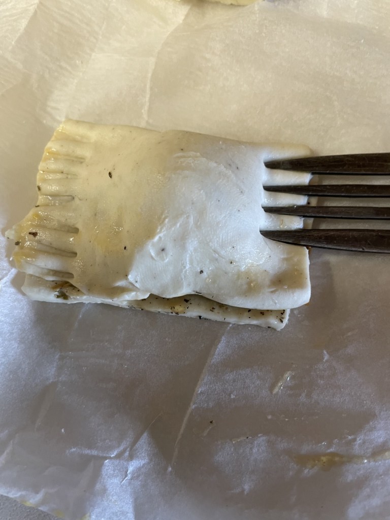 - Using a fork, press the edges of each parcel together and place onto a baking tray.