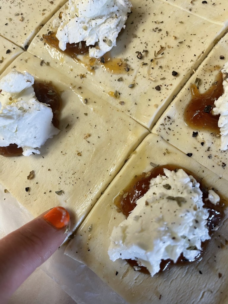 - Divide the goats cheese evenly between each rectangle, placing it on top of the chutney.